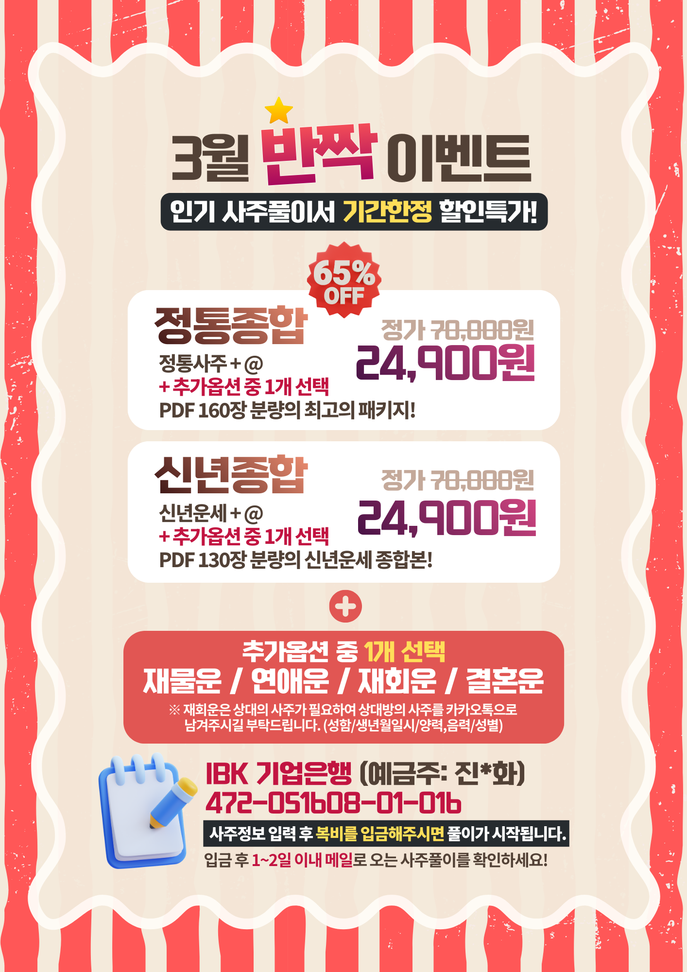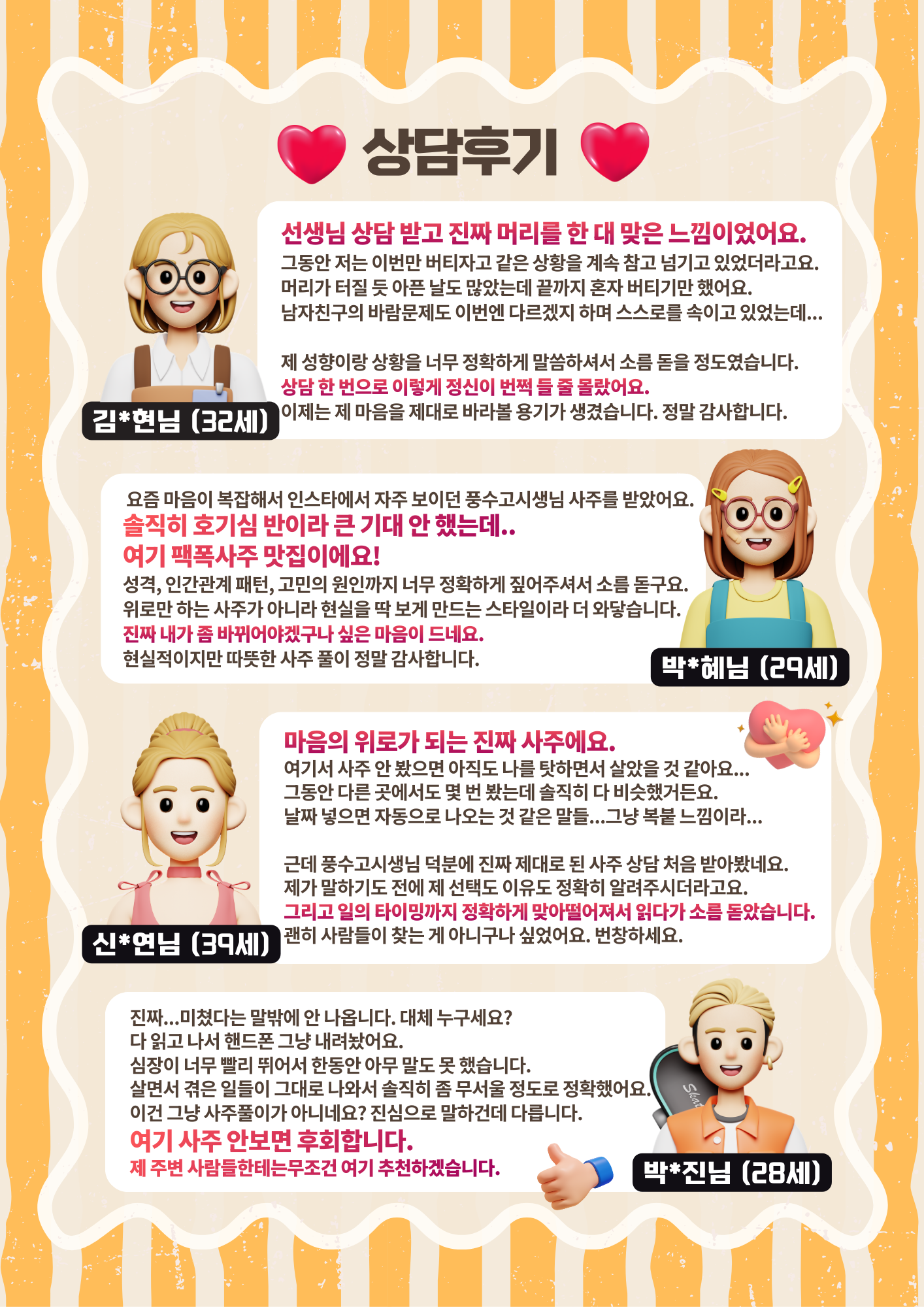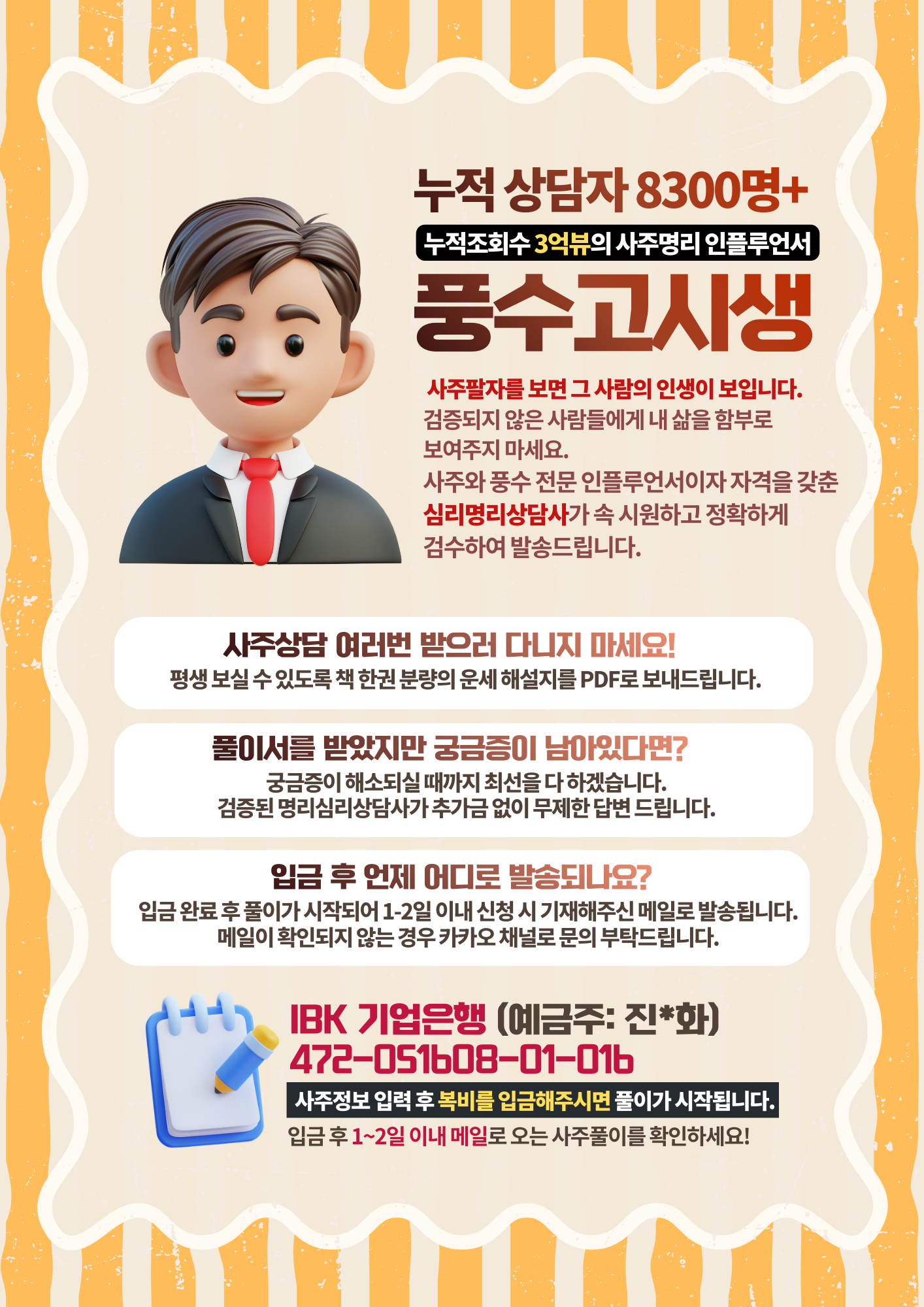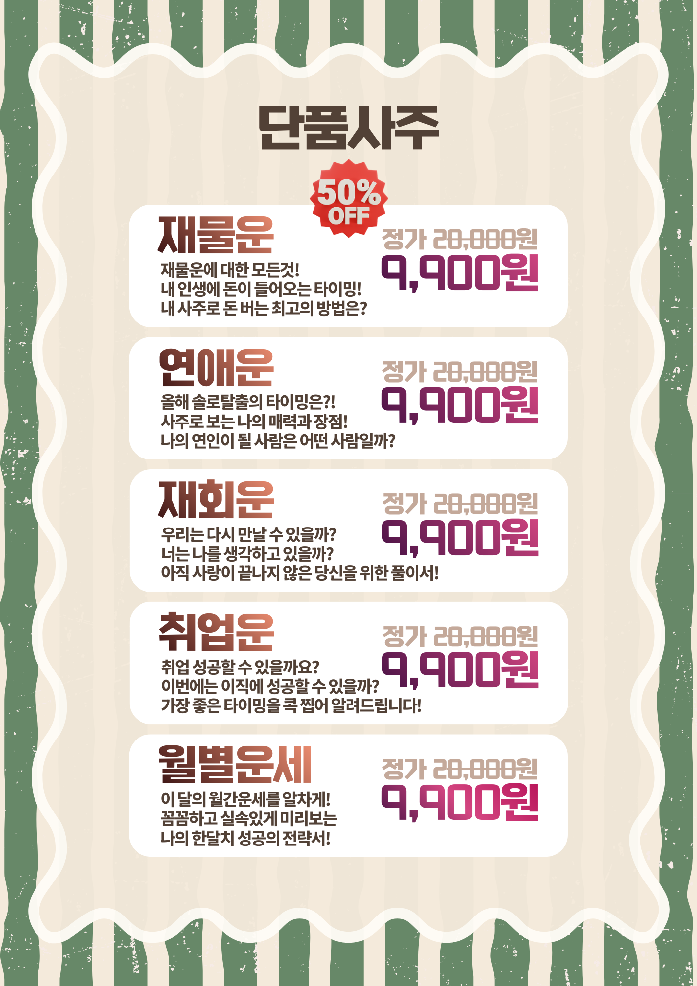 재혼운과 재회운은 반드시 카카오톡 채널로 상대방의 사주 정보를 전달해주셔야 풀이가 가능 합니다.
